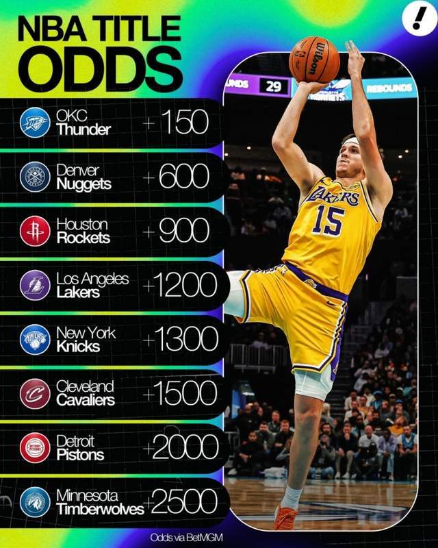 北京时间2025年12月8日,NBA常规赛继续进行,在今日的比赛结束之后,美国的网站也是更新了本赛季的夺冠赔率。在赔率中,前八名的球队分别是雷霆,掘金,火箭,湖人,尼克斯,骑士,活塞和森林狼。